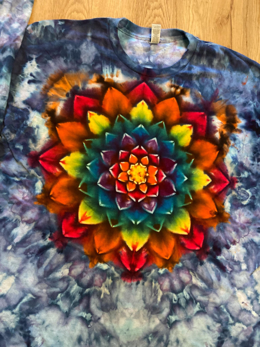 Handmade Mandala Shirt | Trippy Tie Dye Tee | Lotus Flower Shirt | 3XL Shirt | Oversized Tee | Psychedelic Shirt | Long Sleeve Yoga Tee Handmade Shirt, Mandala Shirt, Trippy Tie Dye Tee, Lotus Flower Shirt, 3XL Shirt, Oversized Tee, Psychedelic Shirt, Long Sleeve Yoga Tee, PHandmade mandala lotus flower ltie dye shirt containing vibrant colors with intricate patterns and immense depth
