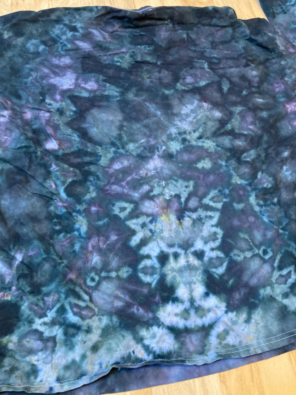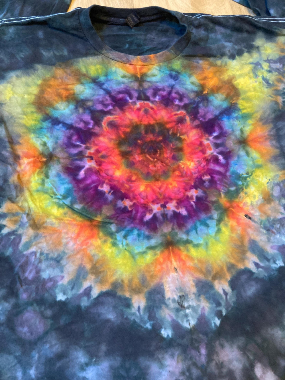 Handmade mandala lotus flower ltie dye shirt containing vibrant colors with intricate patterns and immense depth