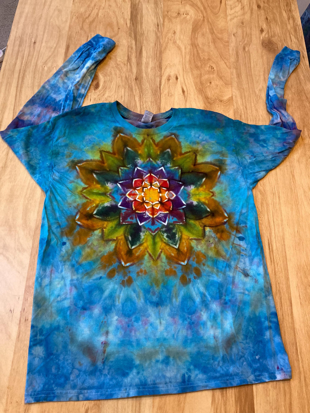 Handmade mandala lotus flower longsleeve tie dye shirt containing vibrant colors with intricate patterns and immense depth
