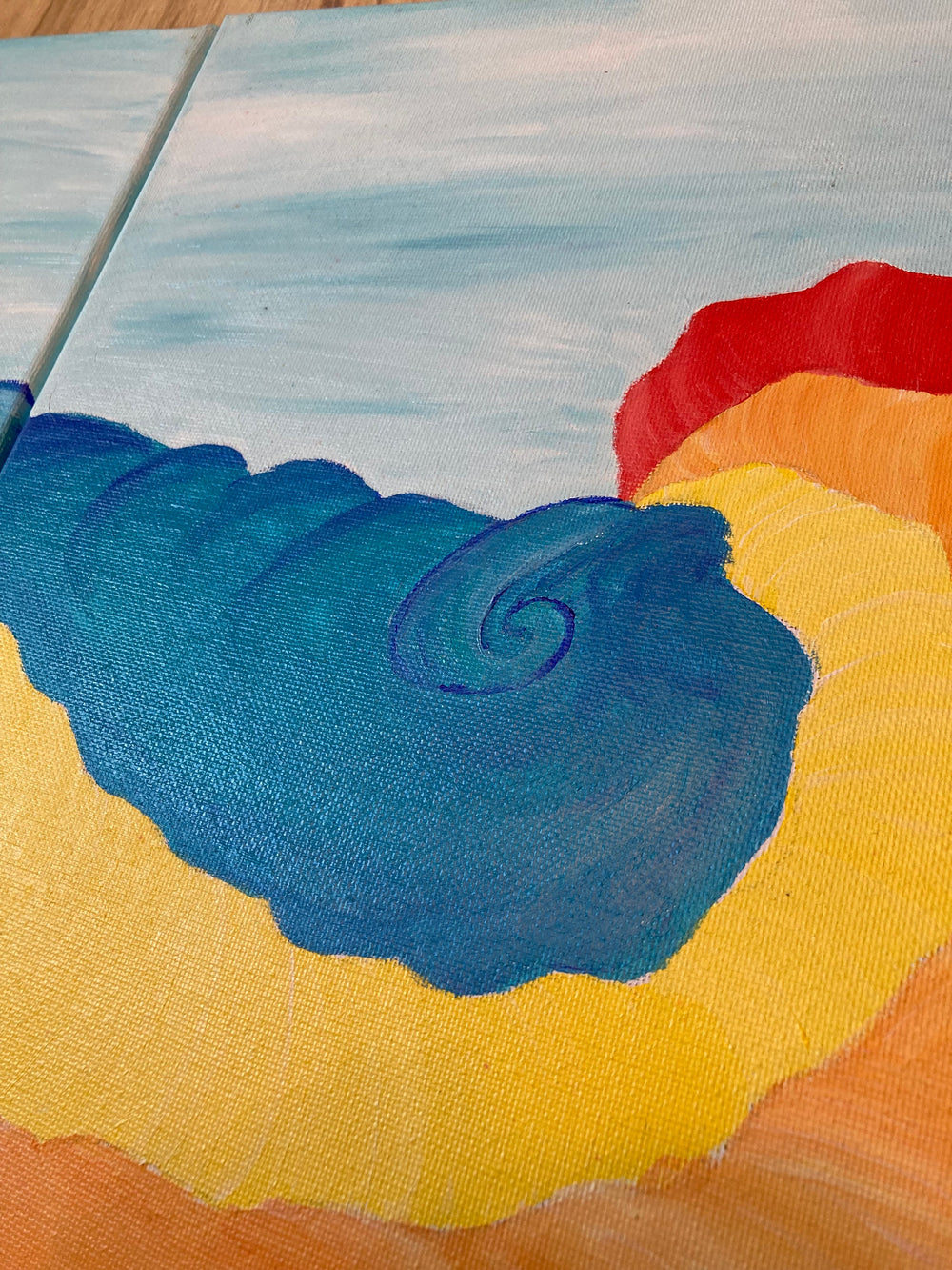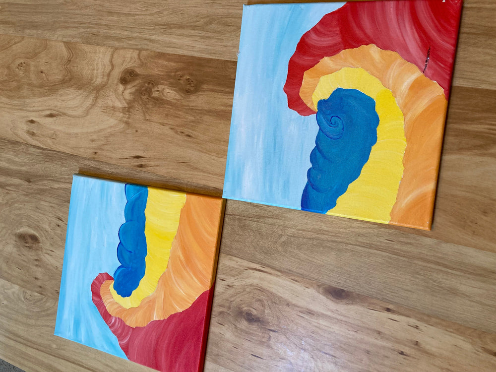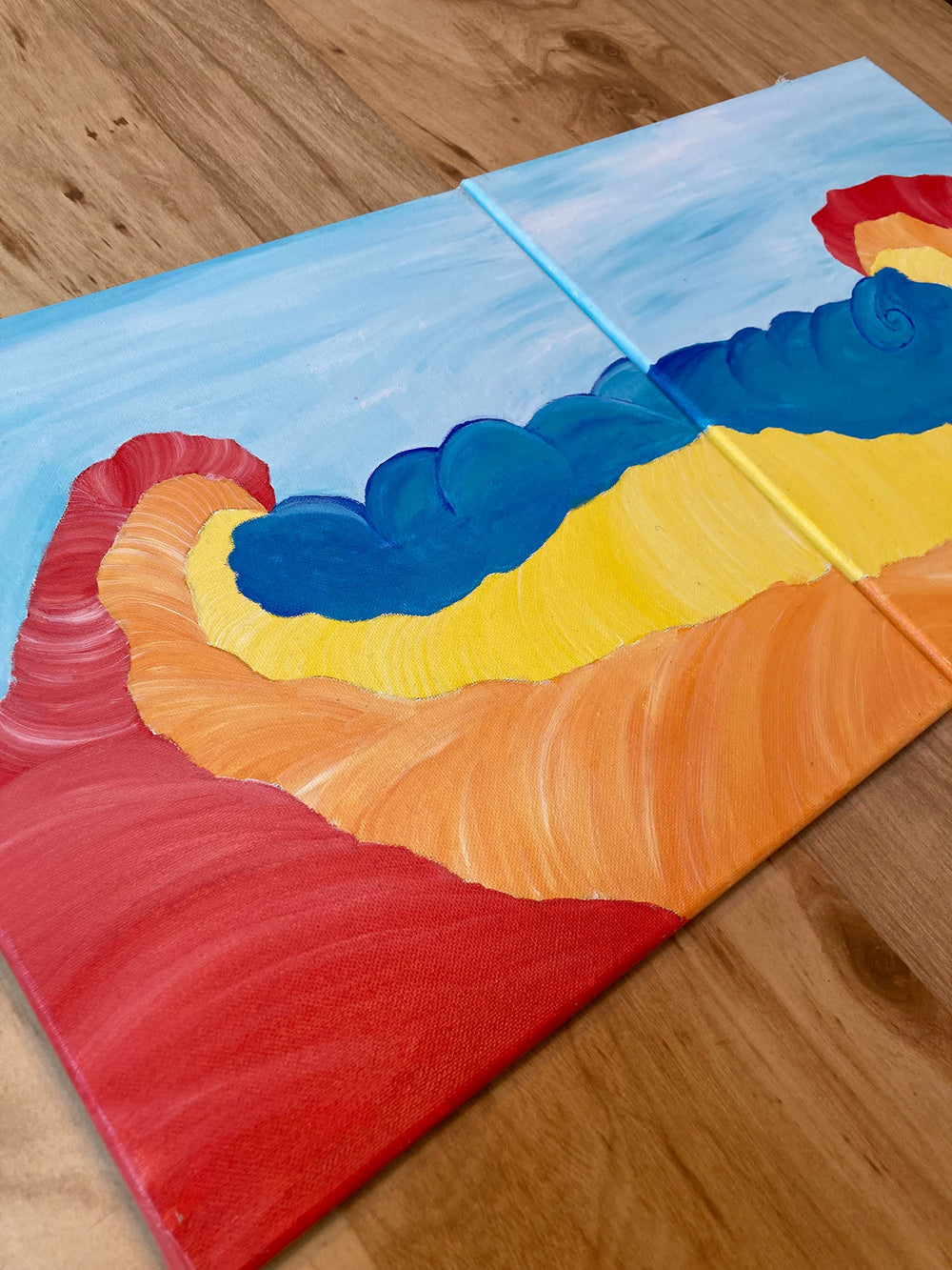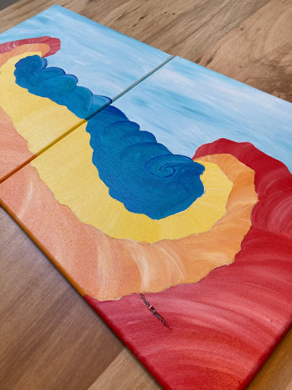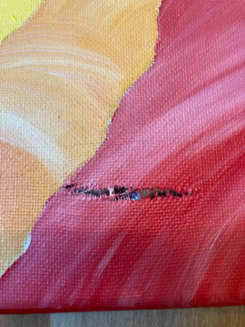 Set of vibrant acrylic on canvas paintings with heavy discount due to large tear in the right panel.