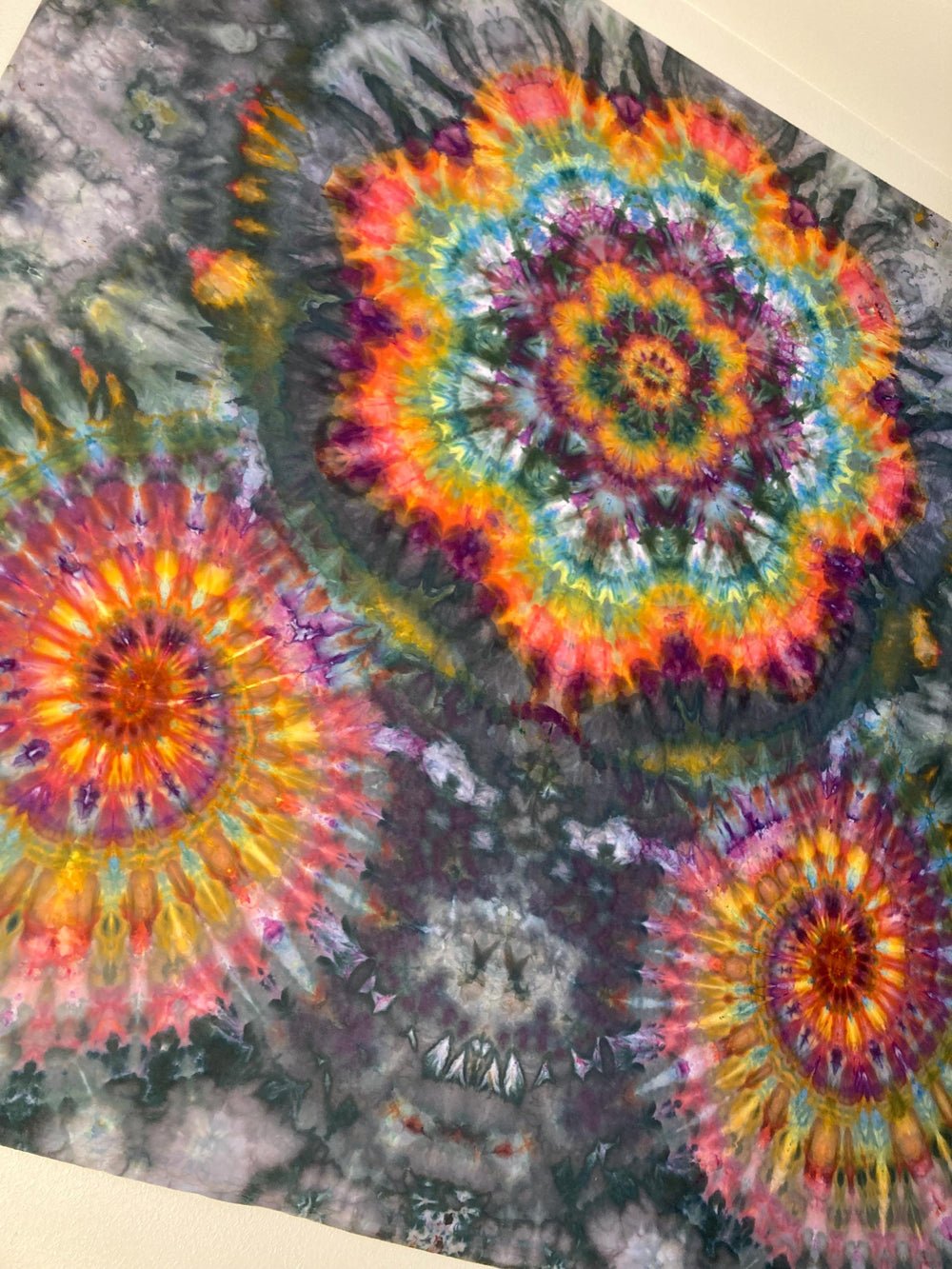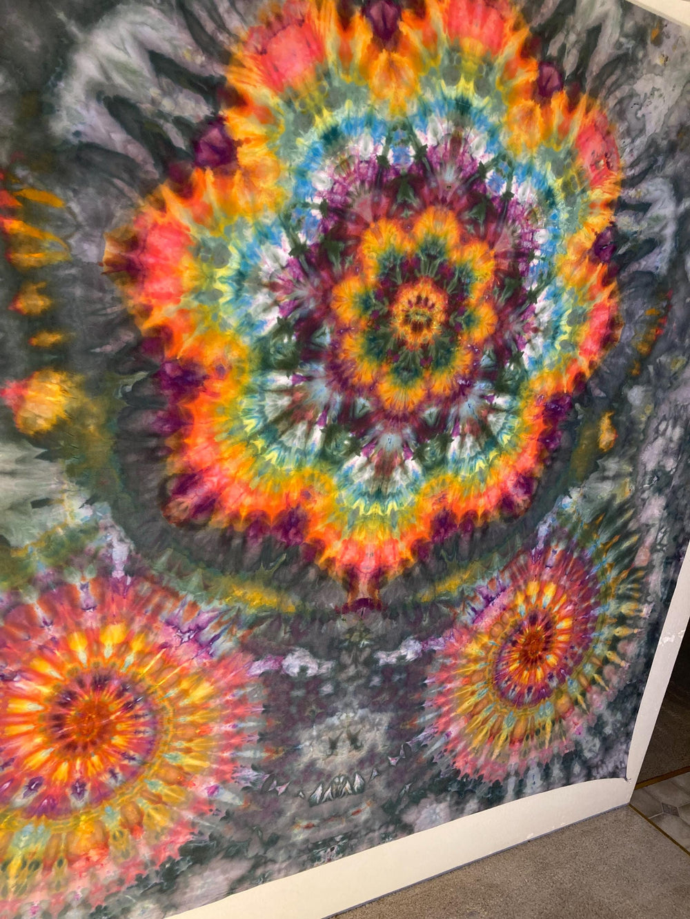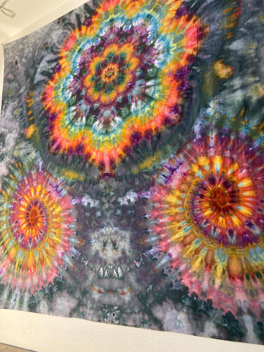 Let the vibrancy of this fine tapestry make your walls pop. May it hang at a festival when seeking insight from within. May it adorn your walls and give further dimensional possibilities to your living space. Do with it what you please it is yours now.Handmade psychedelic tie dye tapestry
