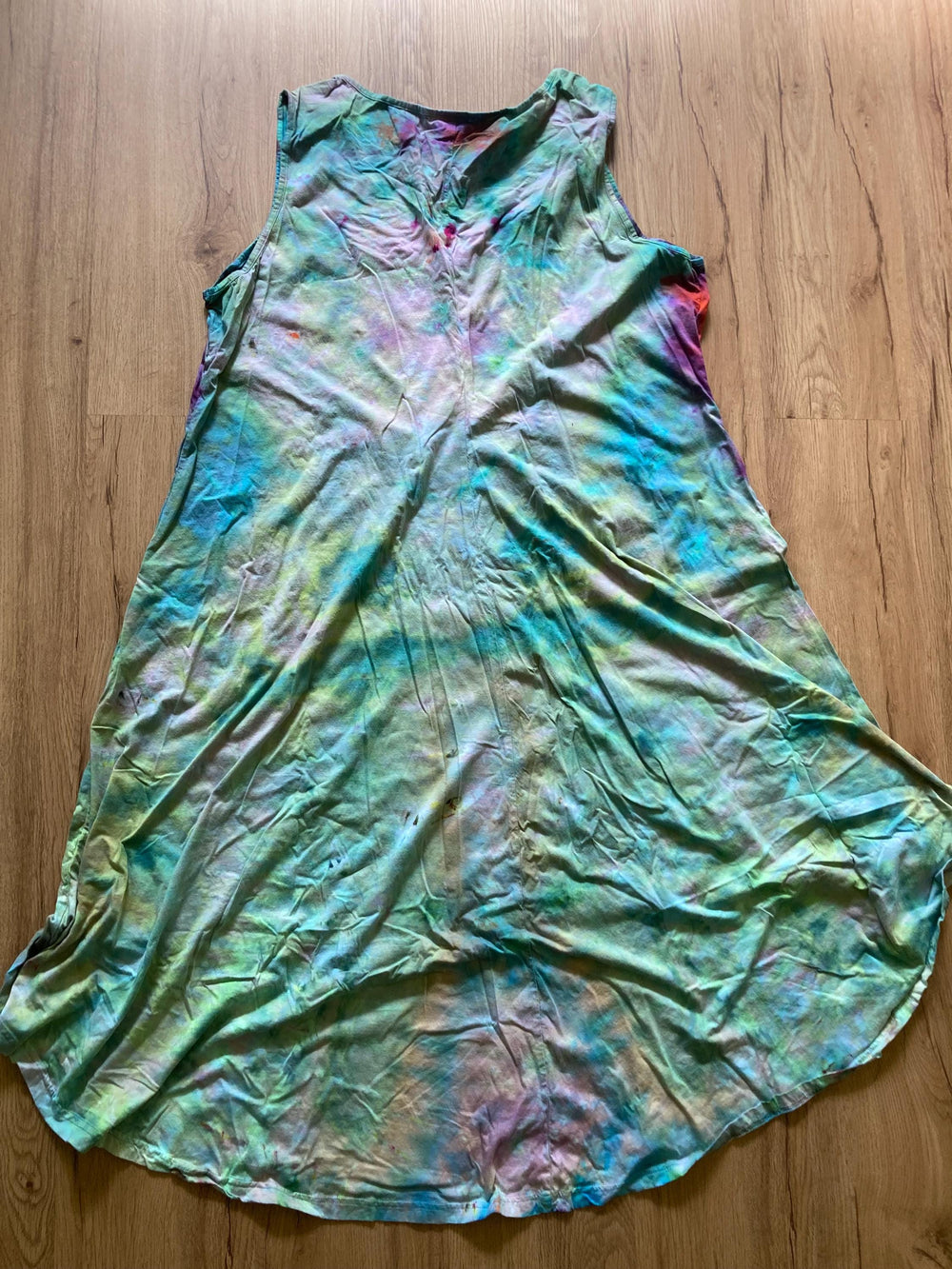 Handmade tie dye dress containing vibrant colors with intricate patterns and immense depth