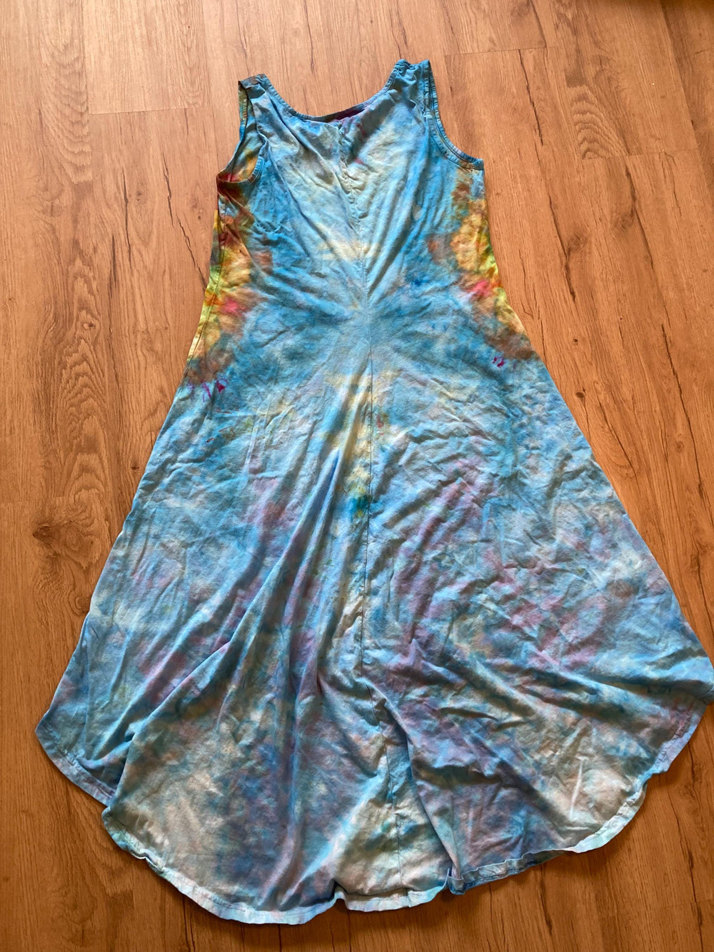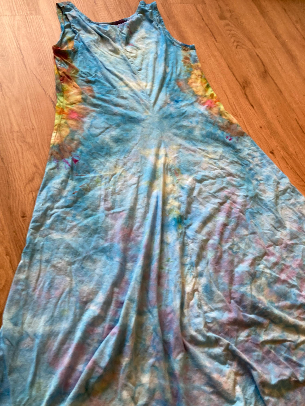 Handmade tie dye dress containing vibrant colors with intricate patterns and immense depth