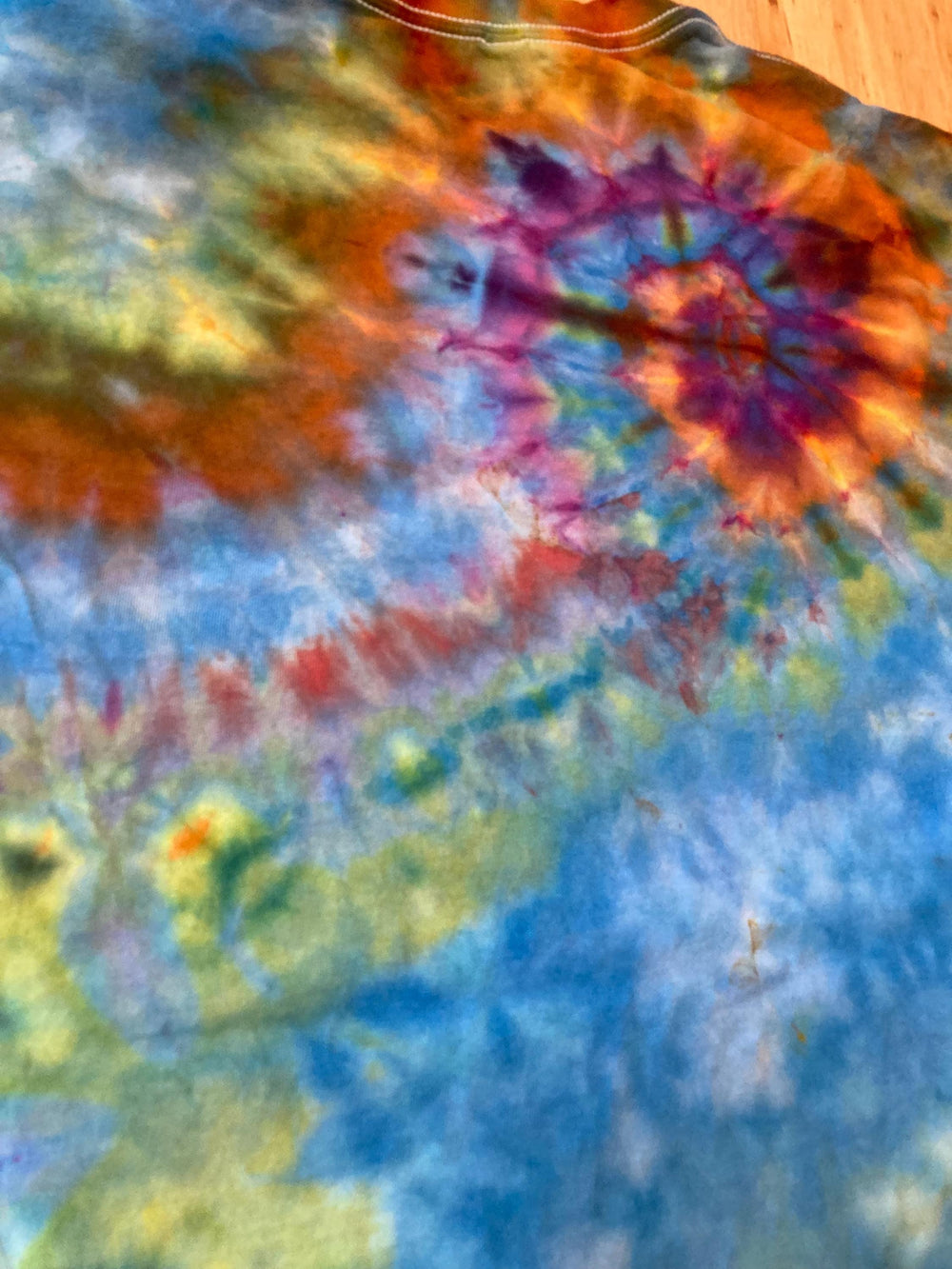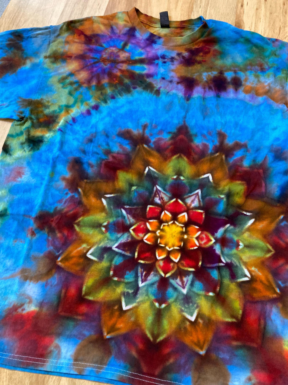 Handmade mandala lotus flower tie dye shirt containing vibrant colors with intricate patterns and immense depth